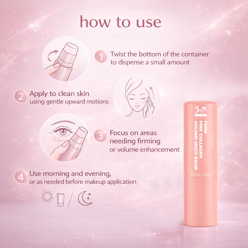 Experience next‑generation skin regeneration. PDRN Pink Collagen Volume Multi Balm harnesses high‑concentration PDRN (polydeoxyribonucleotide) – a bio‑identical DNA fragment clinically proven to accelerate cellular repair, stimulate collagen synthesis, and restore skin density. Infused with hydrolyzed collagen and plumping peptides, this silky pink balm delivers a multi‑action volume effect: instantly firming sagging areas, smoothing deep wrinkles, and replenishing lost facial volume. The rich yet non‑greasy formula locks in 48‑hour hydration while fighting oxidative stress with pink antioxidant complexes. Within one use, feel the tightening; within weeks, enjoy visibly lifted cheeks, defined jawline, and a radiant, glass‑like glow. Use daily on face, neck, décolletage, or any area needing volume restoration. Perfect for aging, sun‑damaged, or post‑procedure skin. No needles, no downtime – just pink science that works.