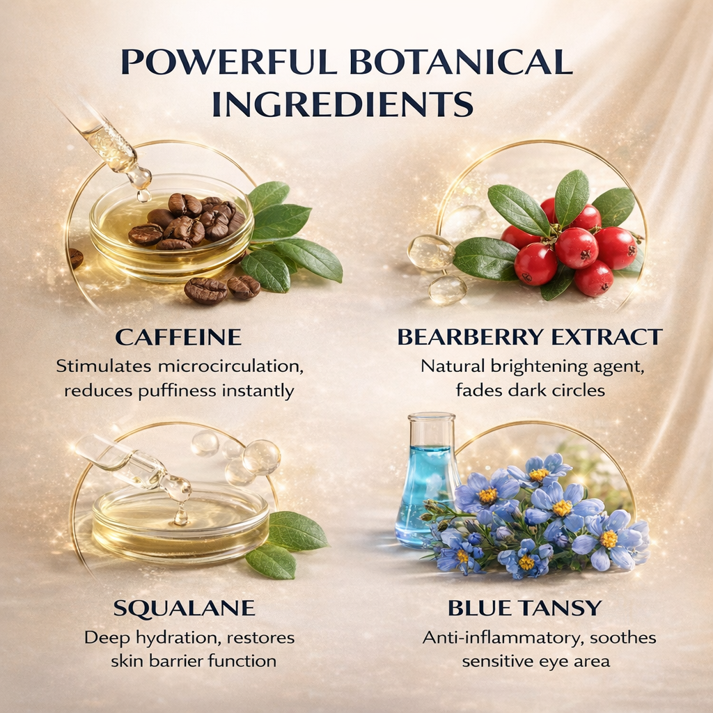 Tired eyes don‘t stand a chance. Under Eye Elixir combines instant brightening effect with 24‑hour de‑puffing technology – delivering immediate radiance while continuously combating fluid retention all day long. This fast‑absorbing serum penetrates deeply to repair fragile under‑eye skin, stimulating collagen and elastin for visible fine line reduction over time. Powered by caffeine complex, vitamin C, and hyaluronic acid, it targets dark circles, morning puffiness, and crepey texture without irritation. Use morning and night: gently tap a drop around the orbital bone. Within seconds, darkness appears lifted and eyes look wide awake. Within weeks, fine lines soften and skin regains firmness. Non‑greasy, ophthalmologist‑tested, and safe for sensitive eyes. No more concealer caking – just real, radiant results. Your under‑eye revival starts now.